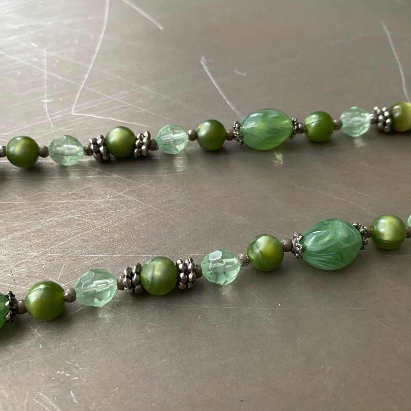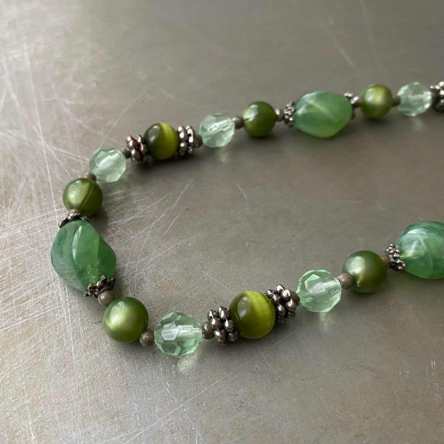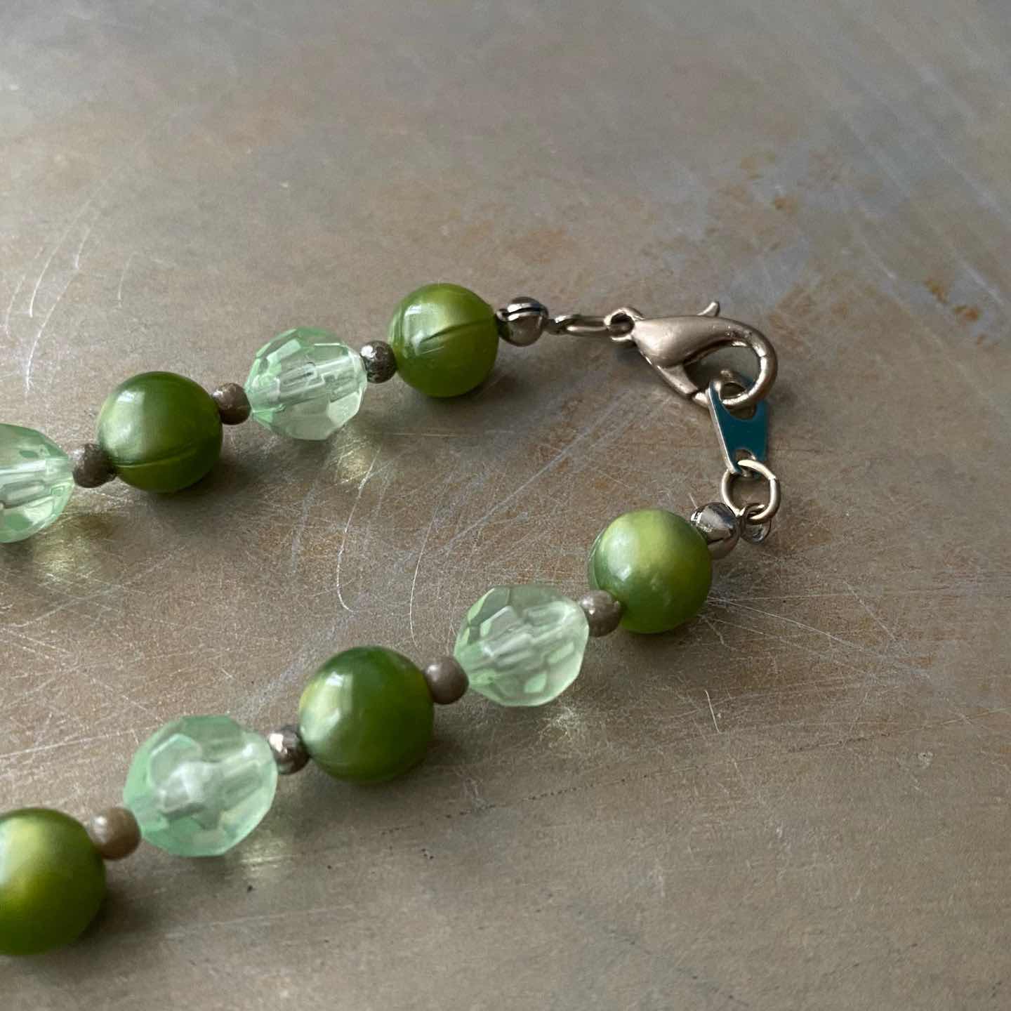 レトロなグリーンのビーズが可愛らしいUSAヴィンテージネックレス。スタイリングに取り入れやすい長さでお顔まわりを明るく彩ってくれます。 □Materials メタル(シルバーメッキ)、プラスチックビーズ □Size 全長 約65.5㎝ 幅 約1.1㎝ 31g □Condition【B】 経年によるメタルの変色はみられますが、目立ったダメージの無い良好な状態です。中古品であることをご理解のうえお買い求めください。ご購入前に必ずショッピングガイドのご確認をお願いいたします。 【S】未使用 【A】未使用に近い 【B】やや使用感あり 【C】使用感あり Item No.3547