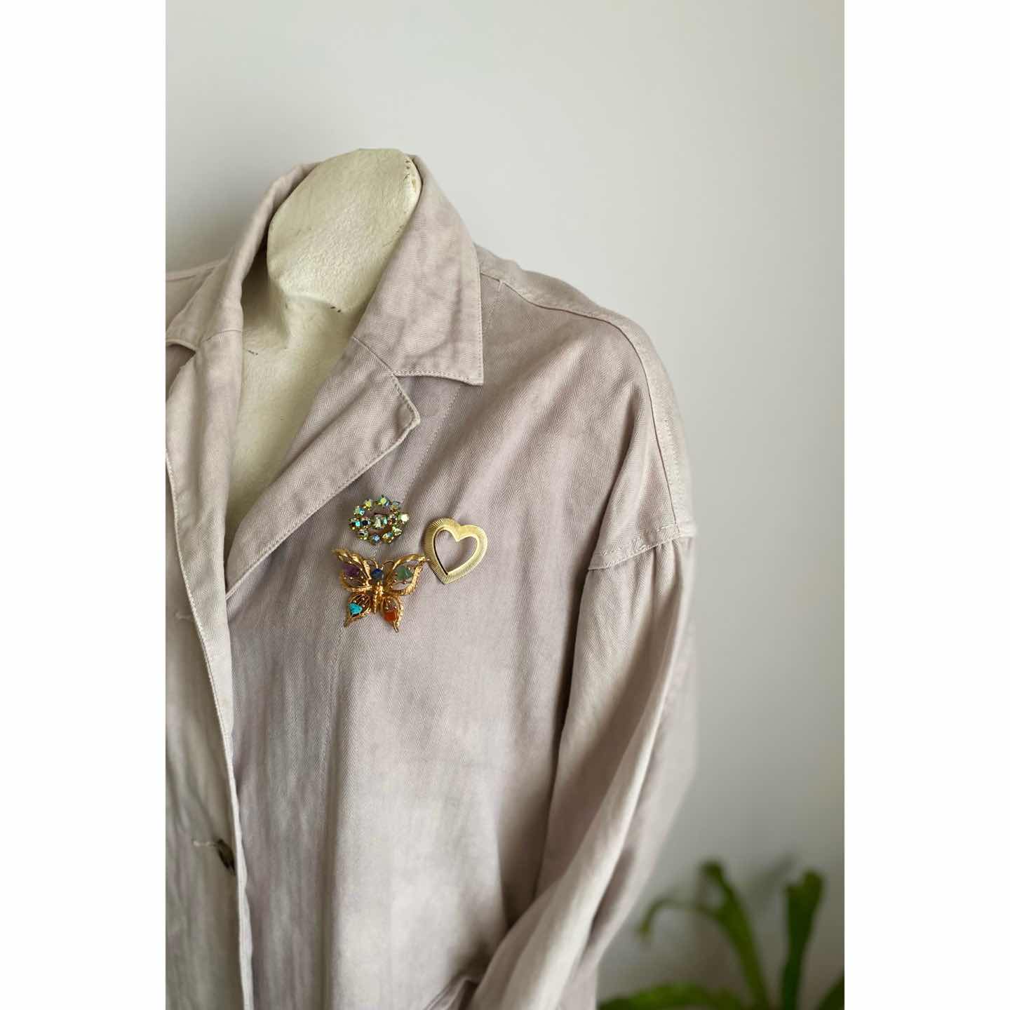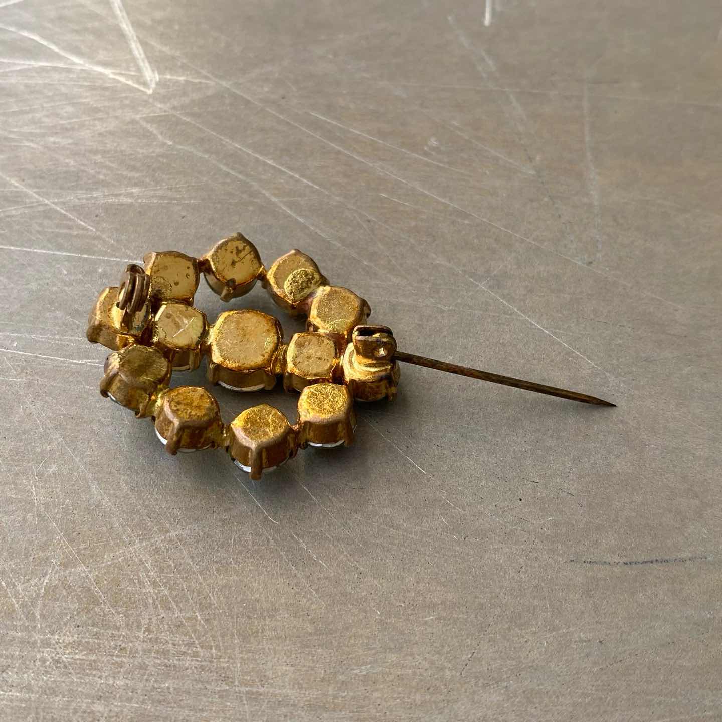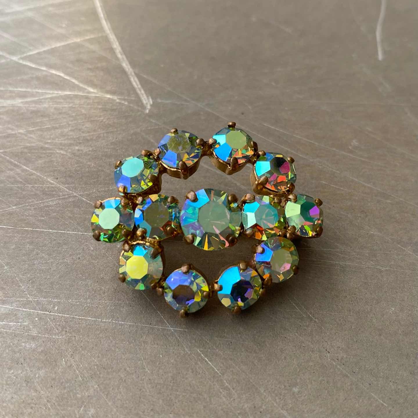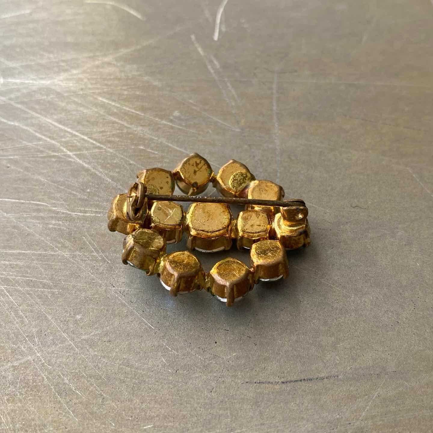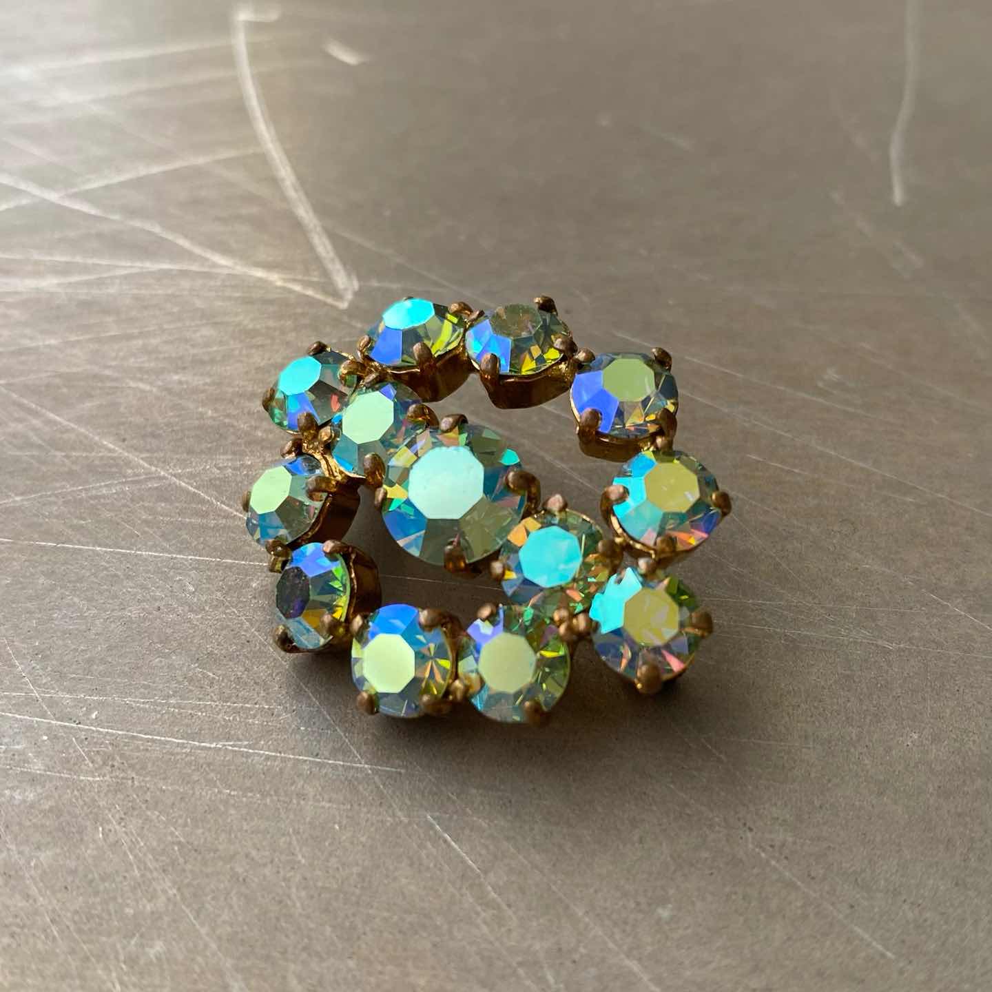 オーロラ色のビジューが輝くレトロ可愛いUSAヴィンテージブローチ。身につけやすいサイズ感で、ジャケットやストール等のアクセントにおすすめです。 □Materials メタル(ゴールドメッキ)、ガラスストーン □Size 約H2.7×W3.1㎝ 6g □Condition【C】 画像の通り、全体的にメッキ変色や剥がれがみられます。古びた雰囲気がお好きな方におすすめです。中古品であることをご理解のうえお買い求めください。ご購入前にショッピングガイドのご確認をお願いいたします。 【S】未使用 【A】未使用に近い 【B】やや使用感あり 【C】使用感あり Item No.3548