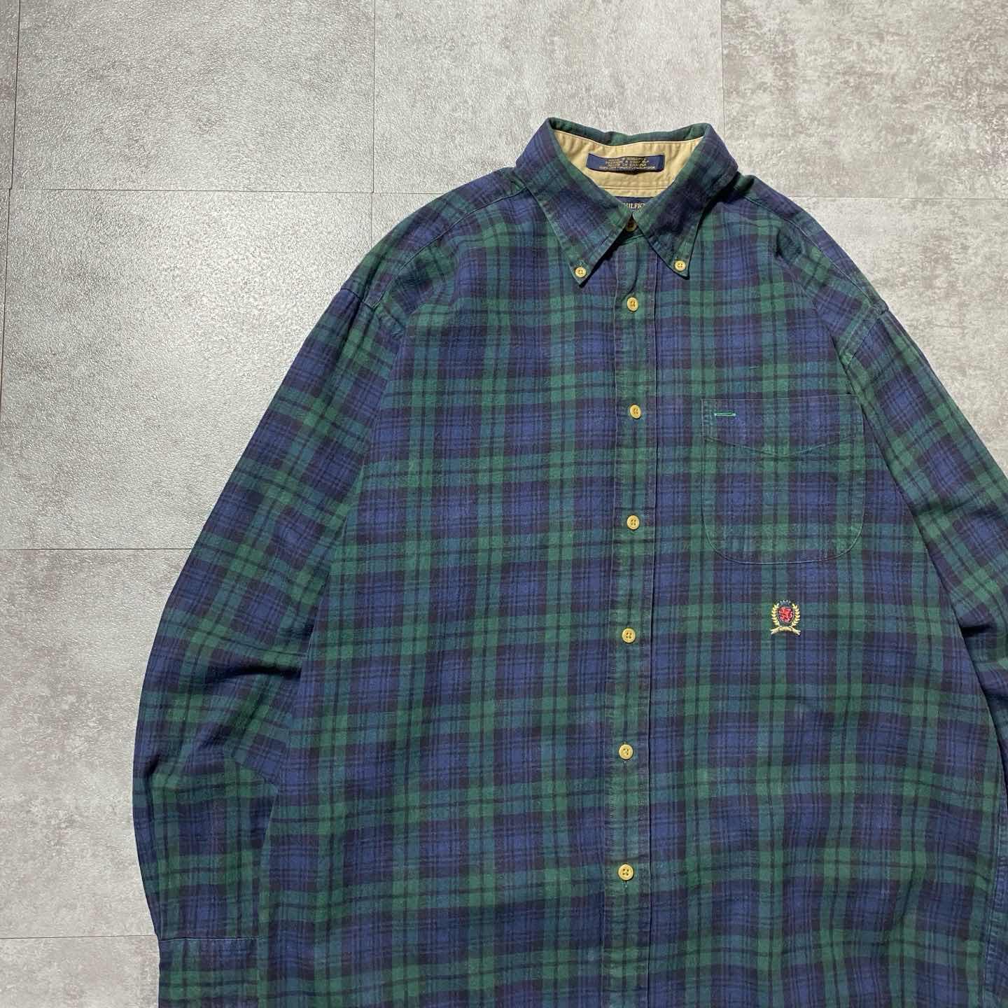 90sトミーヒルフィガー 刺繍ロゴ 胸ポケット チェック総柄 ボタンダウンシャツ